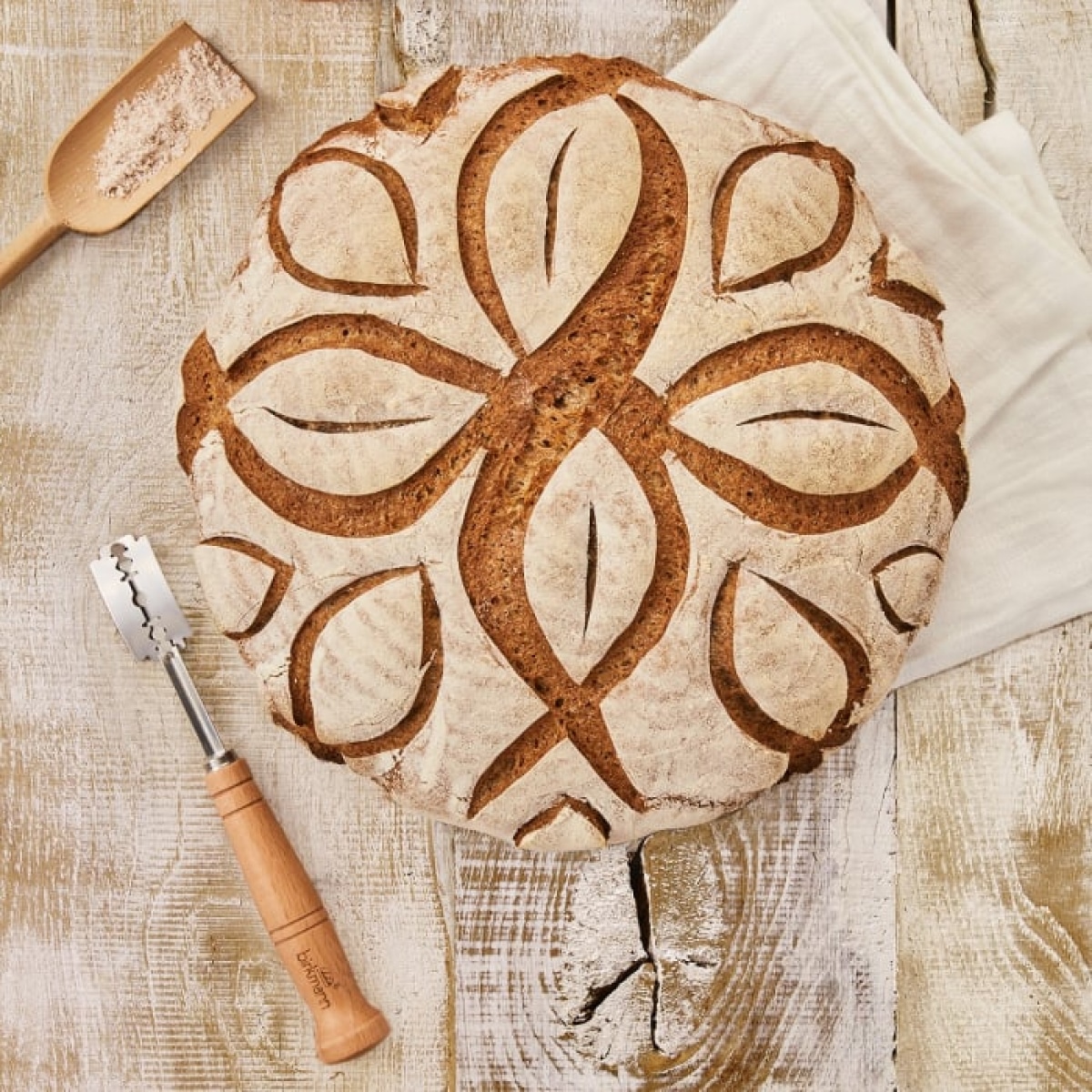 Für dekorative Verzierungen auf selbstgebackenen Broten, mit 5 Ersatzklingen aus Edelstahl, mit Klingenschutz und Anleitung, stabile Qualität, mit ergonomisch geformtem Buchenholzgriff.