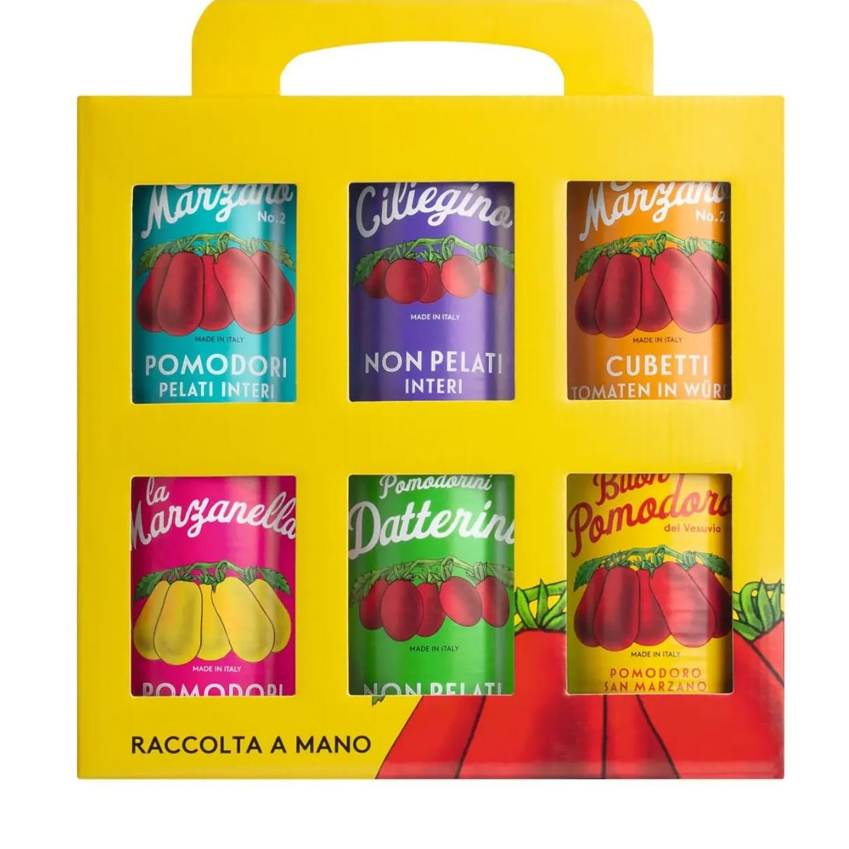 Sechs unterschiedliche Tomatensorten aus Süditalien vereint in einem Set: San Marzano in verschiedenen Verarbeitungsformen, ungeschälte Ciliegino, gelbe Marzanella und Datterini. Das Sortiment verbindet traditionelle Sorten mit sorgfältiger handwerklicher Verarbeitung und bringt Vielfalt in die mediterrane Küche. Verpackt ist die Auswahl in einem leuchtend gelben Pappträger, der sich auch als geschmackvolles Geschenk für Pasta- und Pizzaliebhaber anbietet.