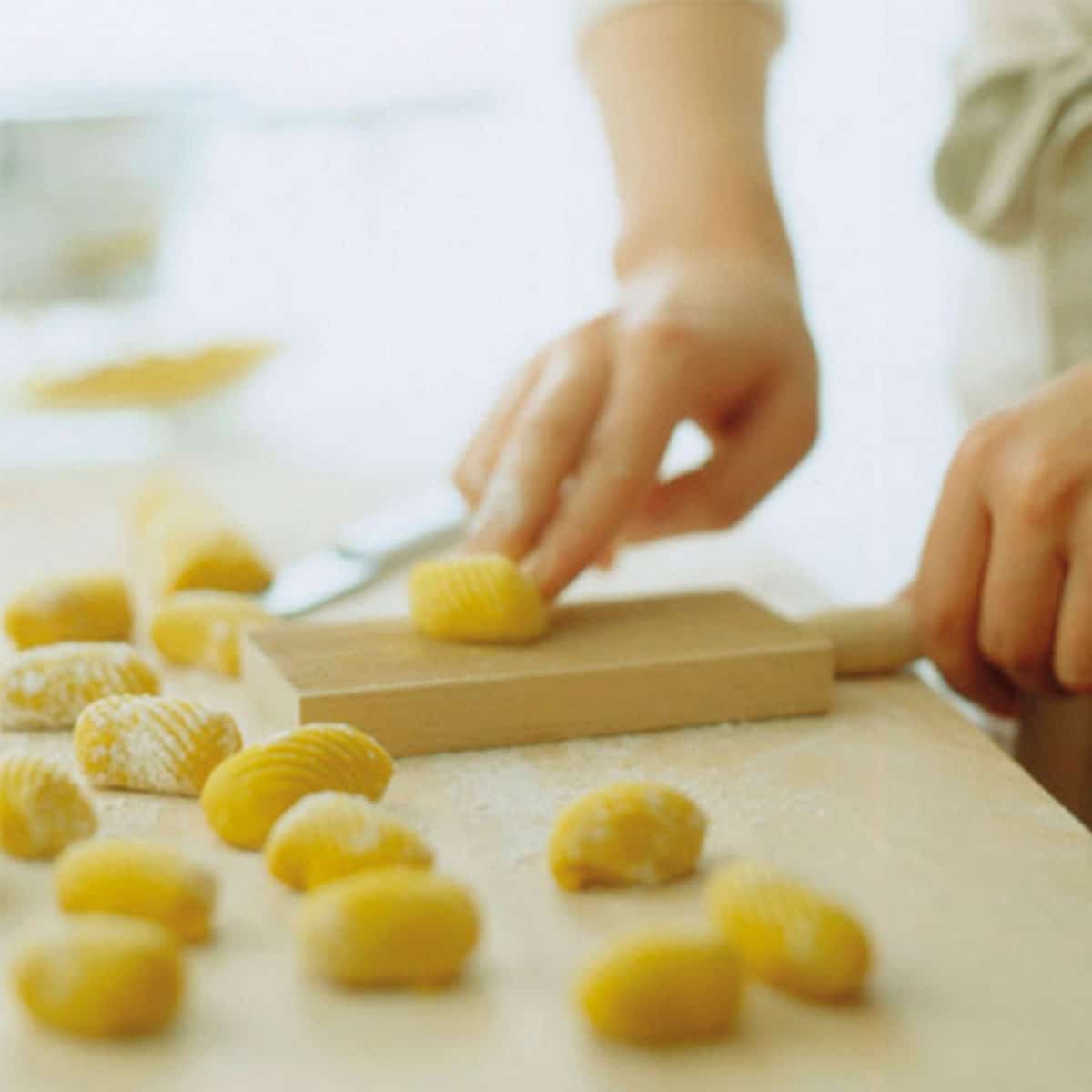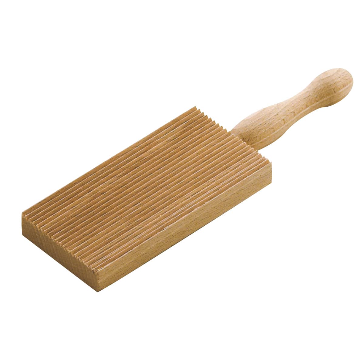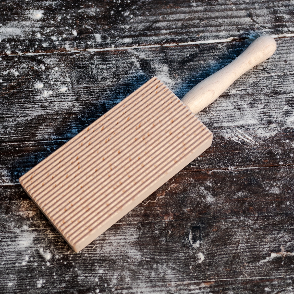 Das klassische Gnocchibrett aus unbehandeltem Buchenholz eignet sich zur Herstellung traditioneller Gnocchi-Varianten wie Kartoffel-, Kürbis- oder Ricotta-Gnocchi. Die gerillte Oberfläche verleiht dem Teig die charakteristische Struktur, in der sich Saucen später gut halten.