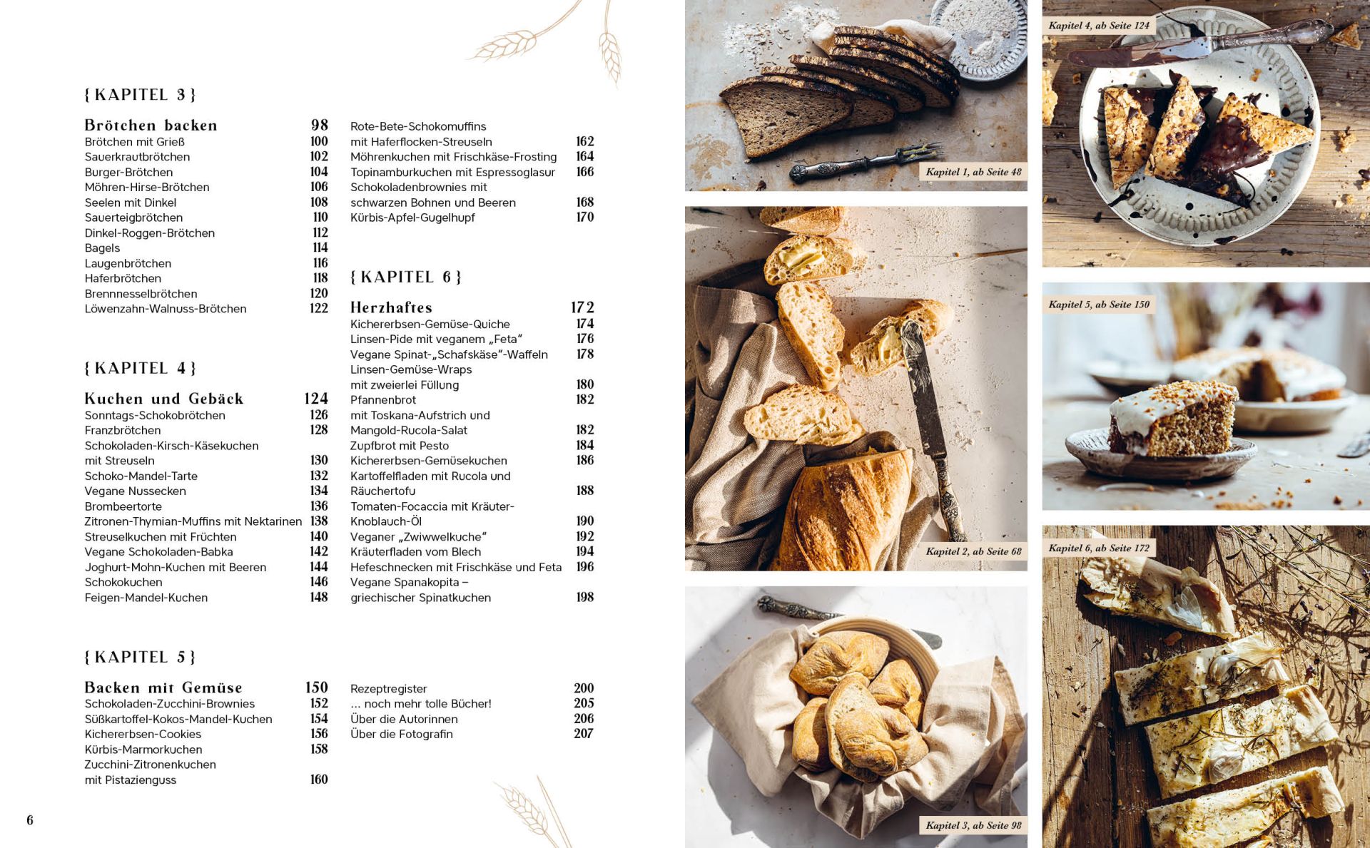 Bewusst und achtsam backen: mit biologischen Zutaten, natürlichen Inhaltsstoffen, veganem Ei-, Butter- oder Milchersatz, glutenfreiem Mehl, Emmer, Dinkel, Körnern, Sauerteig, Hefe und Gemüse.