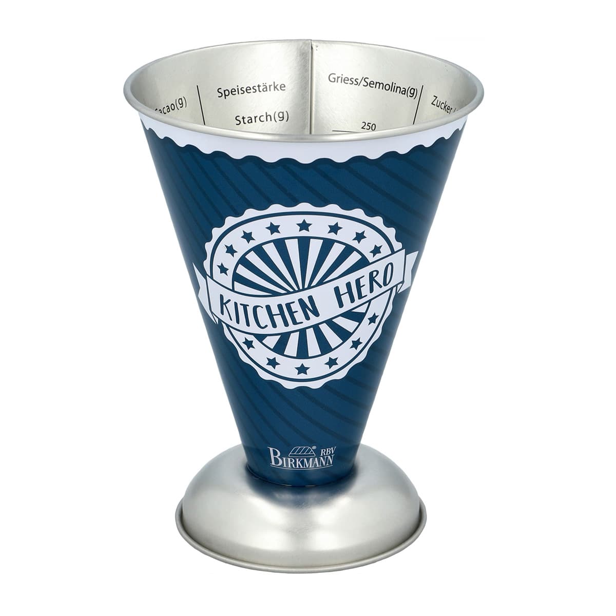 Der Messbecher besteht aus hochwertigem, robustem Weißblech und ermöglicht das einfache Abmessen vieler Zutaten. Die Skalierungen im Inneren sind gut lesbar und decken eine Vielzahl von Messangaben ab, einschließlich Zucker, Mehl, Reis, Kakao, Speisestärke, Grieß und Flüssigkeiten bis 250 ml. Der Messbecher kann nicht nur im Küchenschrank aufbewahrt, sondern auch als Dekoelement in der Küche verwendet werden.